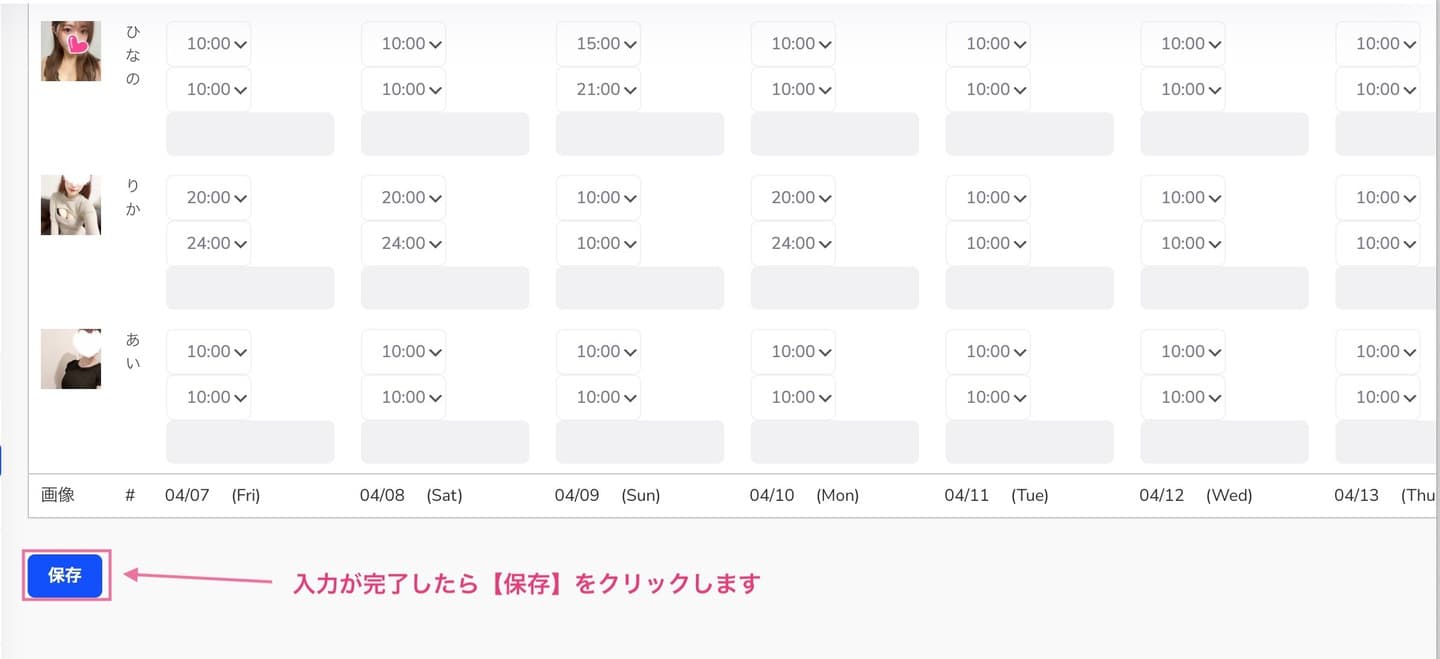 キャスト一覧が表示されますので、該当のキャストの欄の時間の箇所をクリックします