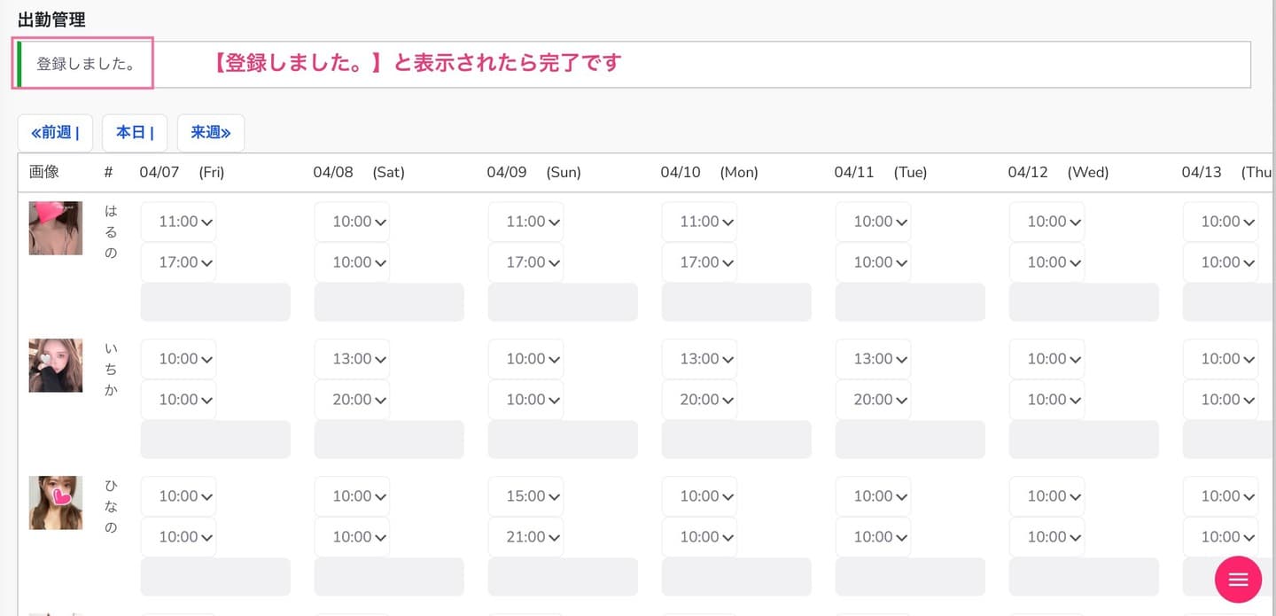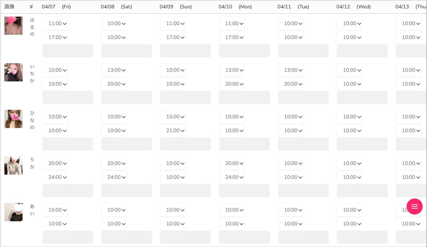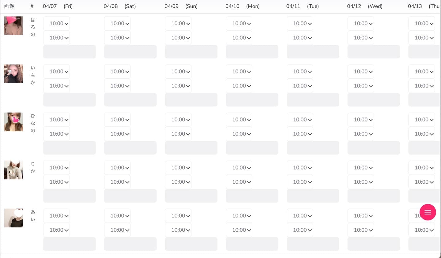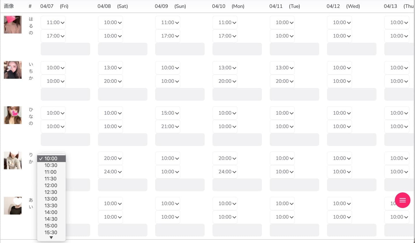 キャスト一覧が表示されますので、該当のキャストの欄の時間の箇所をクリックします